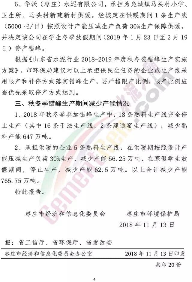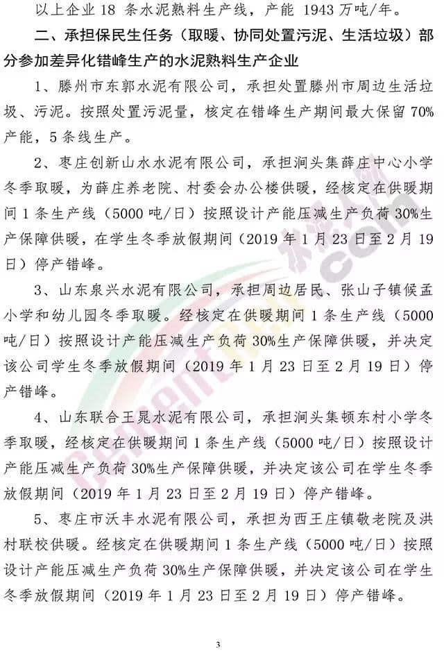 2、棗莊創(chuàng)新山水水泥有限公司,承擔(dān)澗頭集薛莊中心小學(xué)冬季取暖,為薛莊養(yǎng)老院、村委會辦公樓供暖,經(jīng)核定在供暖期間1條生產(chǎn)線(5000噸/日)按照設(shè)計產(chǎn)能壓減生產(chǎn)負荷30%生產(chǎn)保障供暖,在學(xué)生冬季放假期間(2019年1月23日至2月19日)停產(chǎn)錯峰。