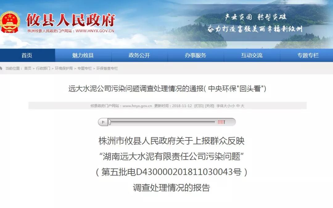 湖南省株洲市攸縣人民政府消息,關(guān)于上報(bào)群眾反映“湖南遠(yuǎn)大水泥有限責(zé)任公司污染問(wèn)題”(第五批電D430000201811030043號(hào)),相關(guān)調(diào)查處理情況如下:
