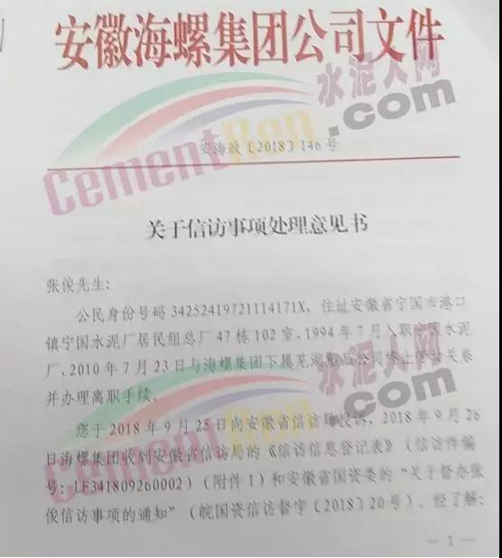 水泥人網(wǎng)通訊員消息,安徽海螺集團(tuán)公司發(fā)布《關(guān)于信訪事項(xiàng)處理意見書》安海政【2018】146號(hào)文件,根據(jù)該文件顯示,信訪人張俊向安徽省信訪局提出如下要求: