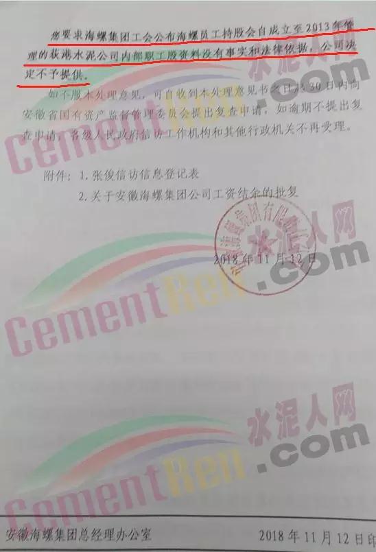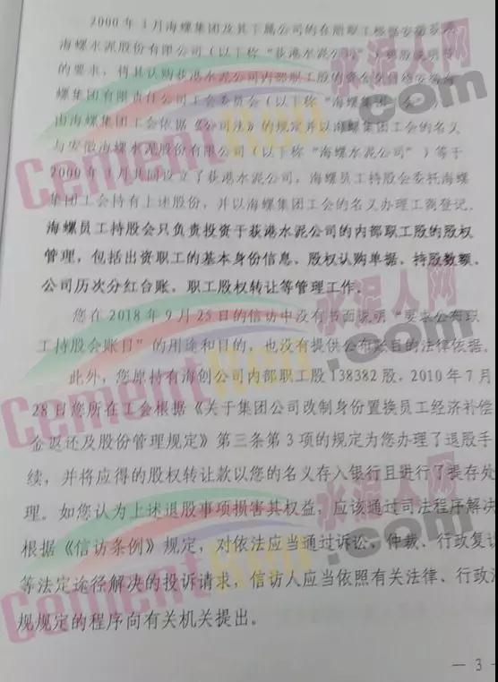 “您要求海螺集團(tuán)工會(huì)公布海螺員工持股會(huì)自成立至2013年管理的荻港水泥公司內(nèi)部職工股資料沒有事實(shí)和法律依據(jù),公司決定不予提供。”