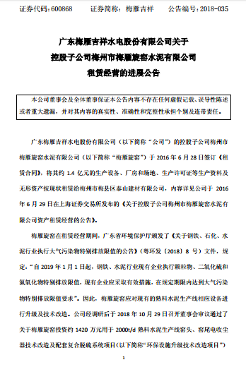廣東省梅雁吉祥水電股份有限公司關(guān)于控股子公司梅州市眉雁旋窯水泥有限公司租賃經(jīng)營的進(jìn)展公告文件如下: