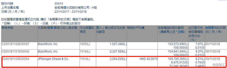 格隆匯獲悉,根據(jù)港交所最新權益披露資料顯示,2018年11月19日,海螺水泥獲JP Morgan Chase & Co.場內(nèi)以每股均價40.0613港元,增持326.45萬股,總價約1.31億港元。