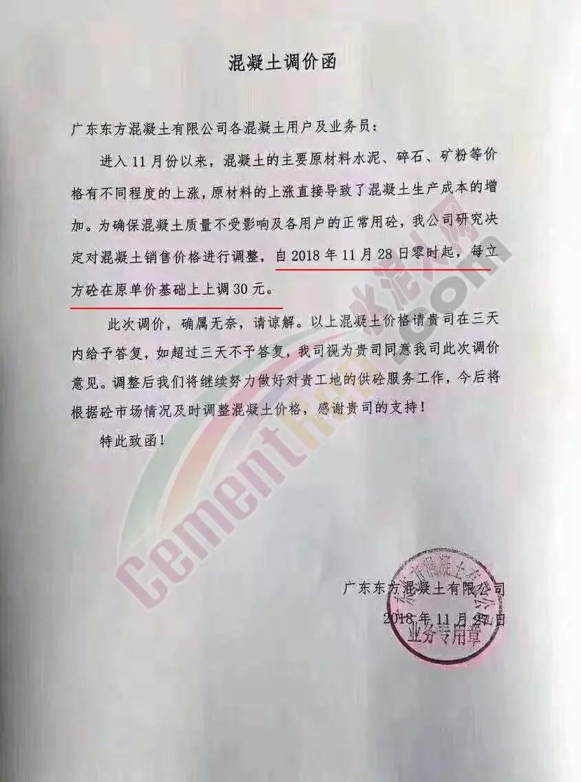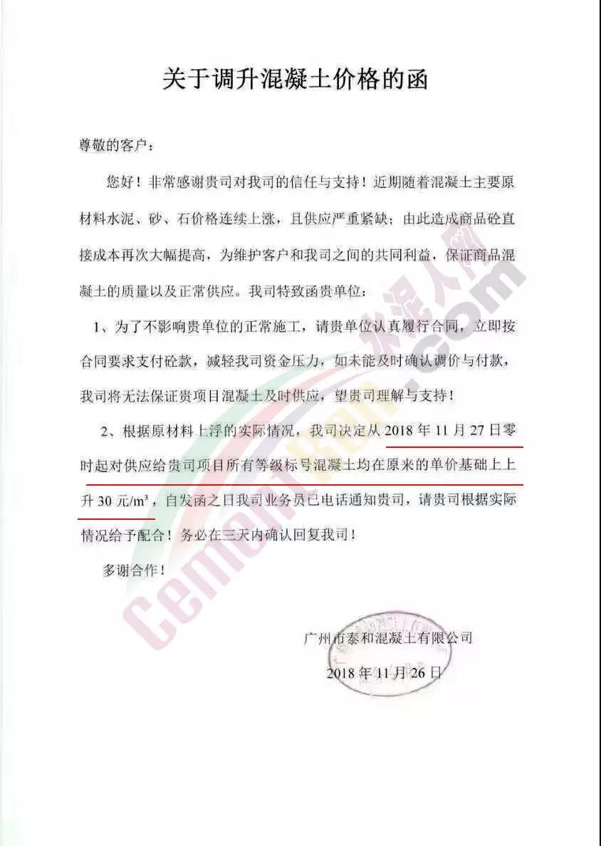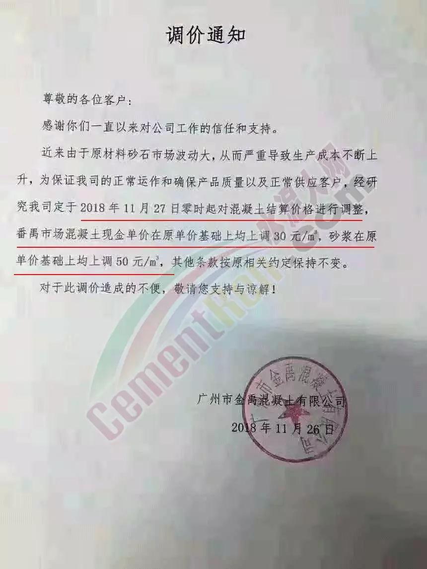 同期,廣東區(qū)域多家商混企業(yè)發(fā)通知提價(jià)。其調(diào)價(jià)通知稱,進(jìn)入11月份后,由于生產(chǎn)商品混凝土/砂漿的主要材料水泥、石等先后幾次漲價(jià),導(dǎo)致混凝土企業(yè)生產(chǎn)成本持續(xù)增加。