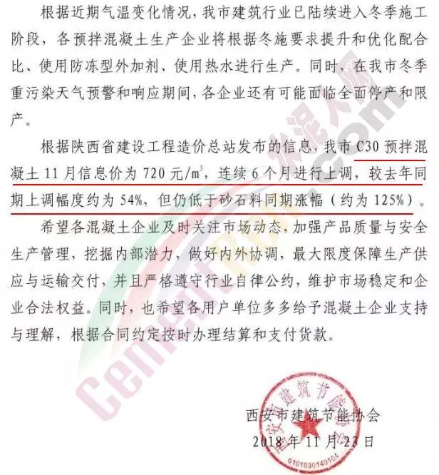 據(jù)了解,根據(jù)陜西省建設(shè)工程造價(jià)總站發(fā)布的信息,西安C30預(yù)拌混凝土11月信息價(jià)為720元/立方米,且已經(jīng)連續(xù)6個(gè)月進(jìn)行上調(diào),較上年同期上調(diào)54%,但仍低于砂石料同期漲幅,砂石料同期漲幅約為125%。西安市建筑節(jié)能協(xié)會(huì)提到希望各混凝土企業(yè)及時(shí)關(guān)注市場(chǎng)動(dòng)態(tài)。