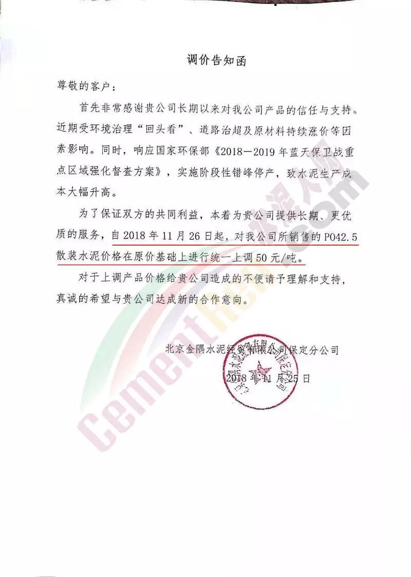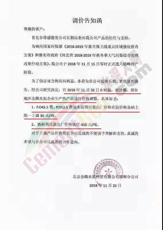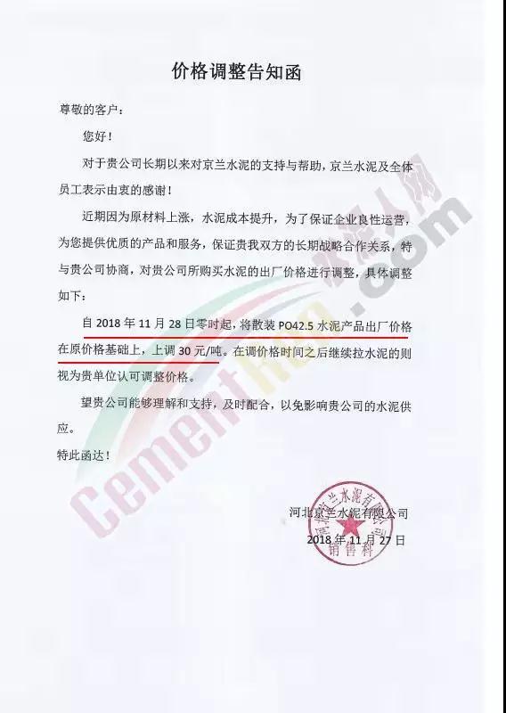 近兩日京津冀地區(qū)又迎來一波漲價(jià)潮。區(qū)域主導(dǎo)企業(yè)金隅水泥經(jīng)貿(mào)公司石家莊、邯鄲、保定等公司陸續(xù)發(fā)布了調(diào)價(jià)通知。石家莊區(qū)域京蘭水泥、曲寨水泥等主要品牌亦同期發(fā)通知上調(diào)水泥價(jià)格。調(diào)價(jià)函如下: