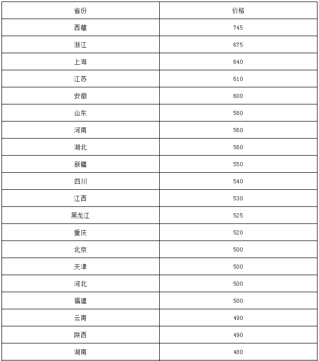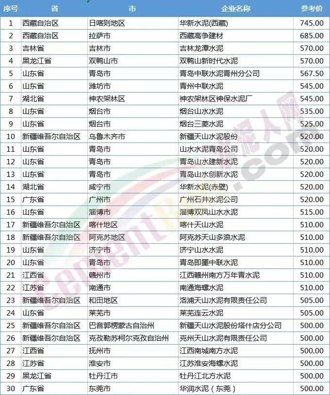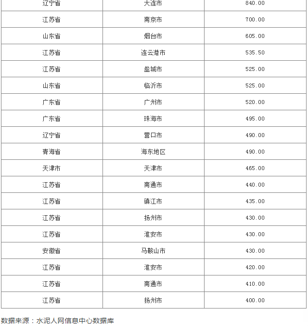 水泥人網(wǎng)信息中心監(jiān)控?cái)?shù)據(jù)顯示,PO42.5散裝水泥最高價(jià)格還是在西藏高原,最高價(jià)格為745元,第二名為浙江區(qū)域,最高價(jià)為675元/噸。