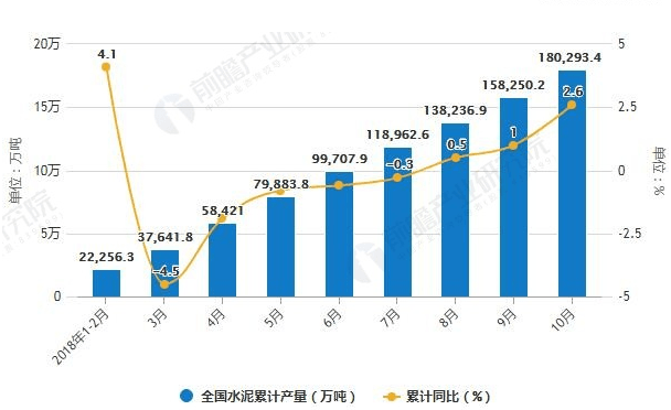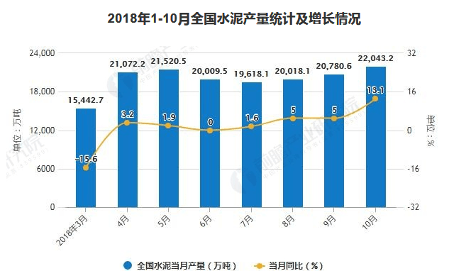 2018年1-10月全國水泥產量統(tǒng)計及增長情況