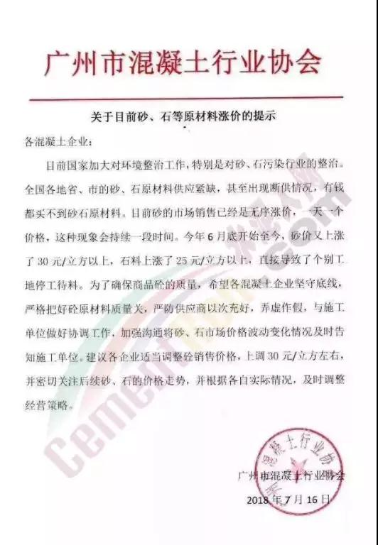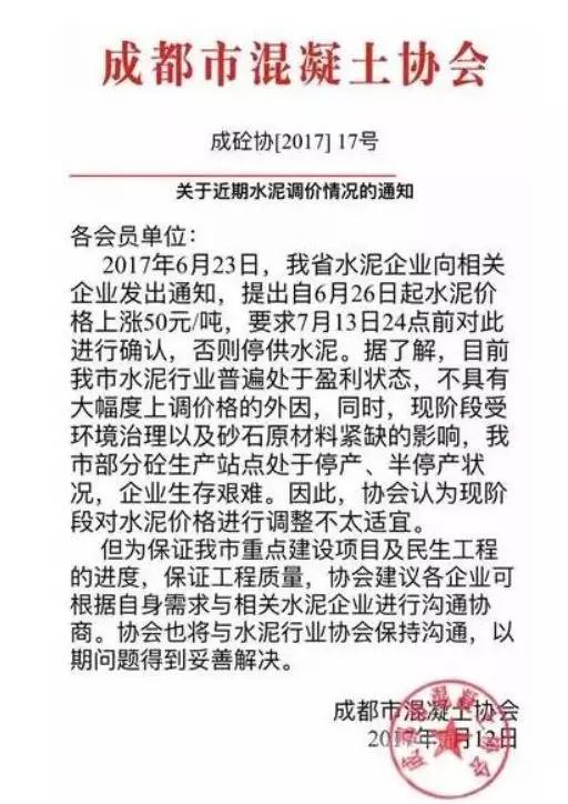 信件指出,“水泥企業(yè)無(wú)序漲價(jià),引發(fā)市場(chǎng)混亂”,“且告知混凝土企業(yè),如不在漲價(jià)函上簽字確認(rèn),將予以停止水泥供應(yīng),此舉還從側(cè)面引發(fā)了預(yù)拌混凝土其他原材料(如粉煤灰、礦粉等)的漲價(jià)趨勢(shì),對(duì)本來(lái)已經(jīng)岌岌可危的混凝土企業(yè)造成致命一擊。”