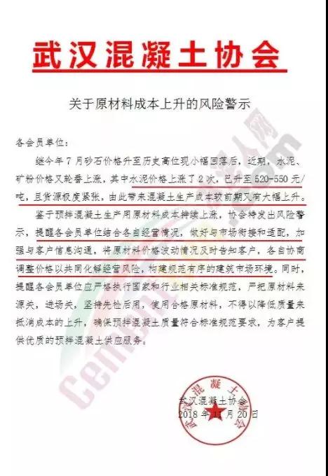 因全國(guó)水泥價(jià)格持續(xù)上漲,下游混凝土企業(yè)受影響比較大,但是這次跟以往最大的不同是各混凝土企業(yè)并不是像之前發(fā)布對(duì)漲價(jià)指責(zé)的函件,而只是輕描淡寫(xiě)的發(fā)布了一些預(yù)警通知: