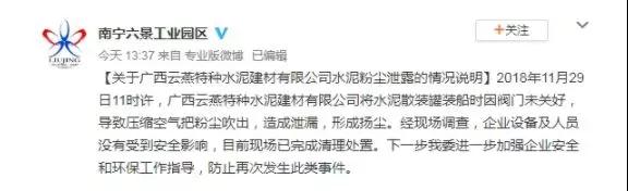 說(shuō)明指,2018年11月29日11時(shí)許,廣西云燕特種水泥建材有限公司將水泥散裝罐裝船時(shí)因閥門未關(guān)好,壓縮空氣把粉塵吹出,造成泄漏,產(chǎn)生揚(yáng)塵。經(jīng)現(xiàn)場(chǎng)調(diào)查,企業(yè)設(shè)備及人員沒(méi)有受到安全影響,目前現(xiàn)場(chǎng)已完成清理處置。