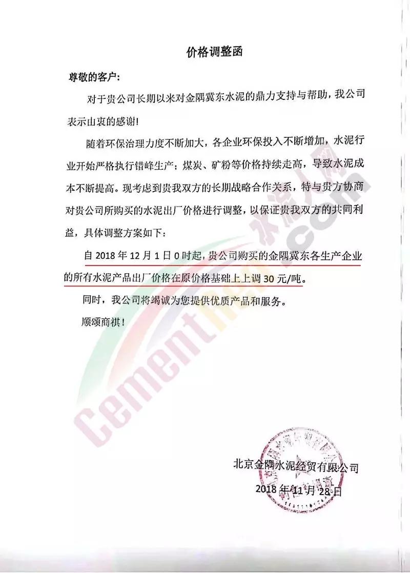 日前,華北地區(qū)主導(dǎo)企業(yè)金隅冀東水泥集中發(fā)布調(diào)價(jià)通知。其中,北京金隅經(jīng)貿(mào)有限公司調(diào)價(jià)通知稱(chēng),隨著環(huán)保治理力度不斷加大,各企業(yè)環(huán)保投入不斷增加,水泥行業(yè)開(kāi)始嚴(yán)格執(zhí)行錯(cuò)峰生產(chǎn)。同時(shí),煤炭、礦粉等價(jià)格持續(xù)走高,導(dǎo)致水泥成本不斷提高。企業(yè)將于12月1日起上調(diào)各生產(chǎn)企業(yè)的所有水泥產(chǎn)品出廠價(jià)格,上調(diào)幅度30元/噸。