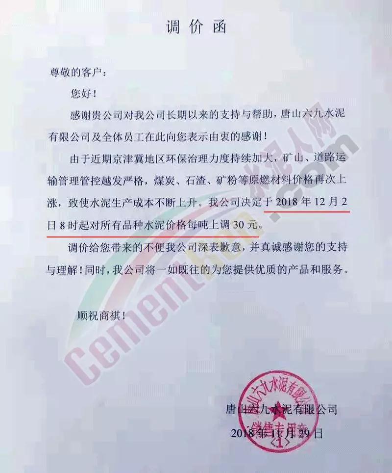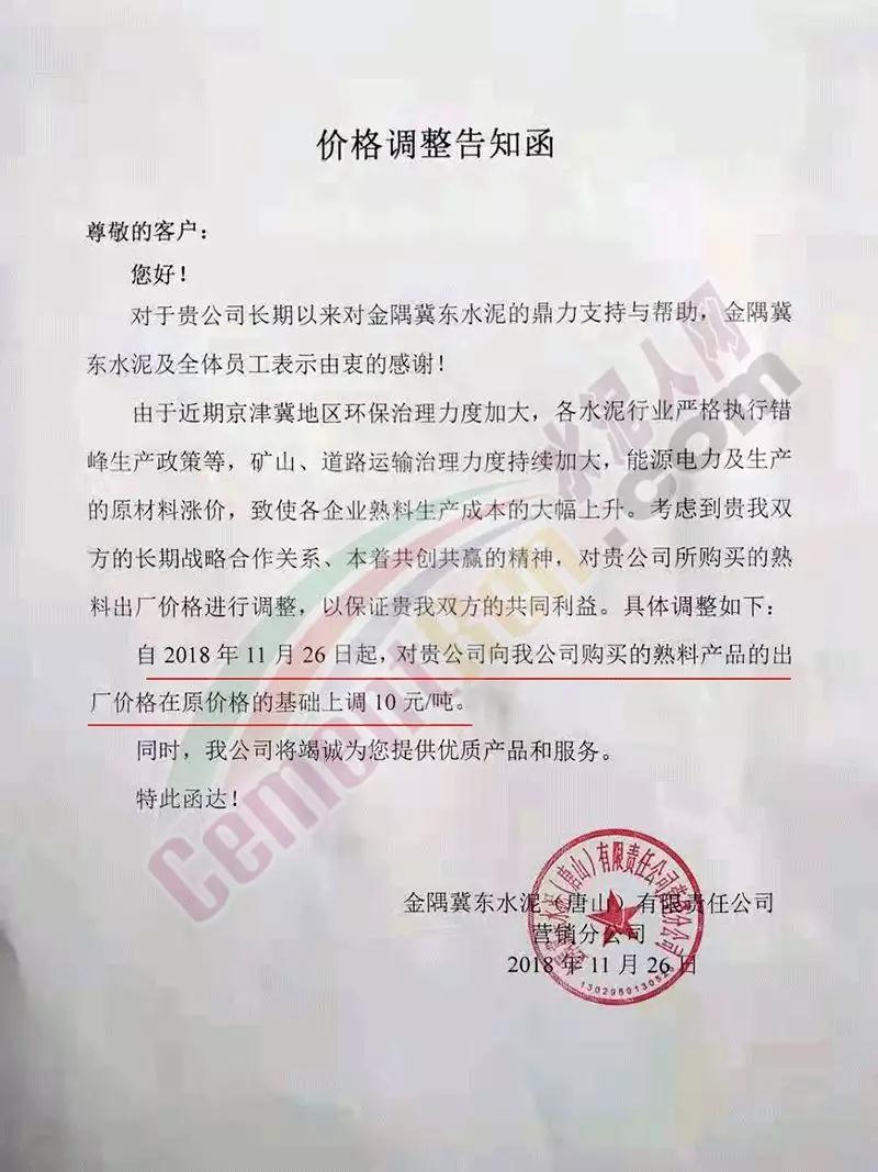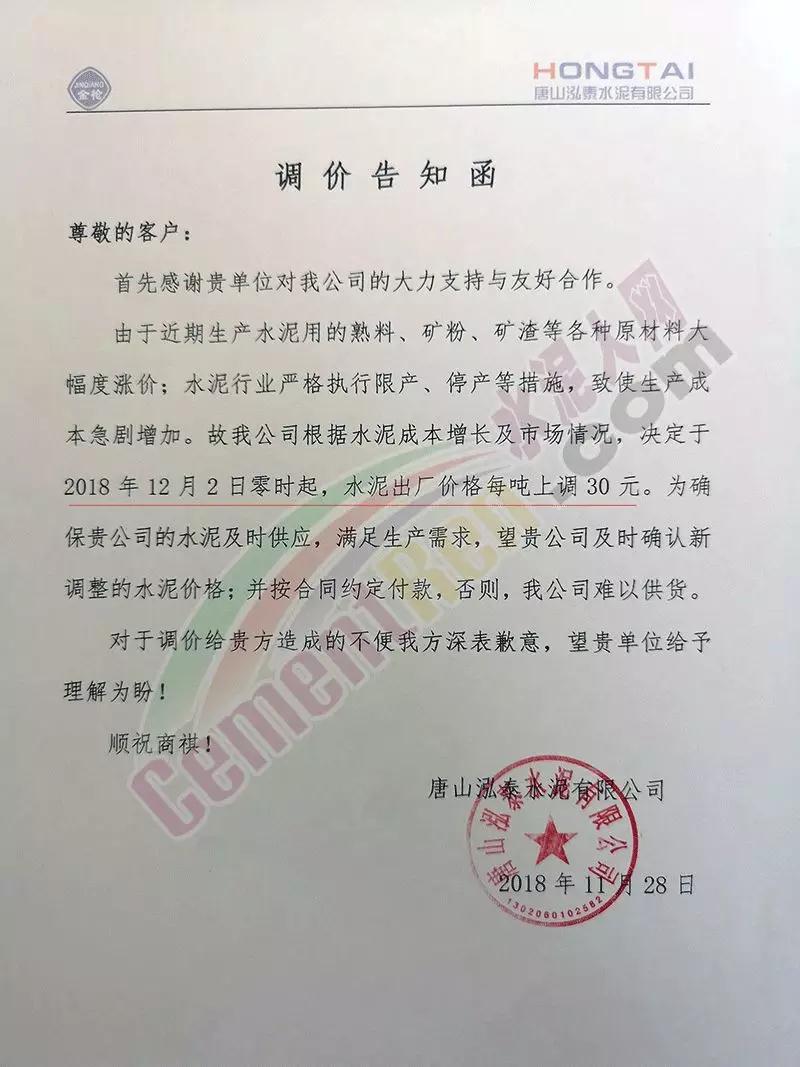 同期唐山燕東水泥,唐山泓泰水泥,六九水泥也跟隨發(fā)布了調(diào)價(jià)通知,稱(chēng)自下月初起上調(diào)了水泥出廠價(jià)格,上調(diào)幅度30元/噸。