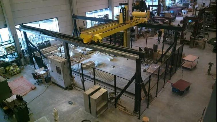 鋼鐵大橋MX3D研究和發(fā)展公司利用3D混凝土打印技術“打印”出一座鋼鐵橋梁。該橋長約24英尺,位于荷蘭阿姆斯特丹市中心,擁有非常復雜的幾何學設計。該公司利用建筑專用3D打印機器人歷時兩個月便完成了一座精美的鋼鐵大橋。