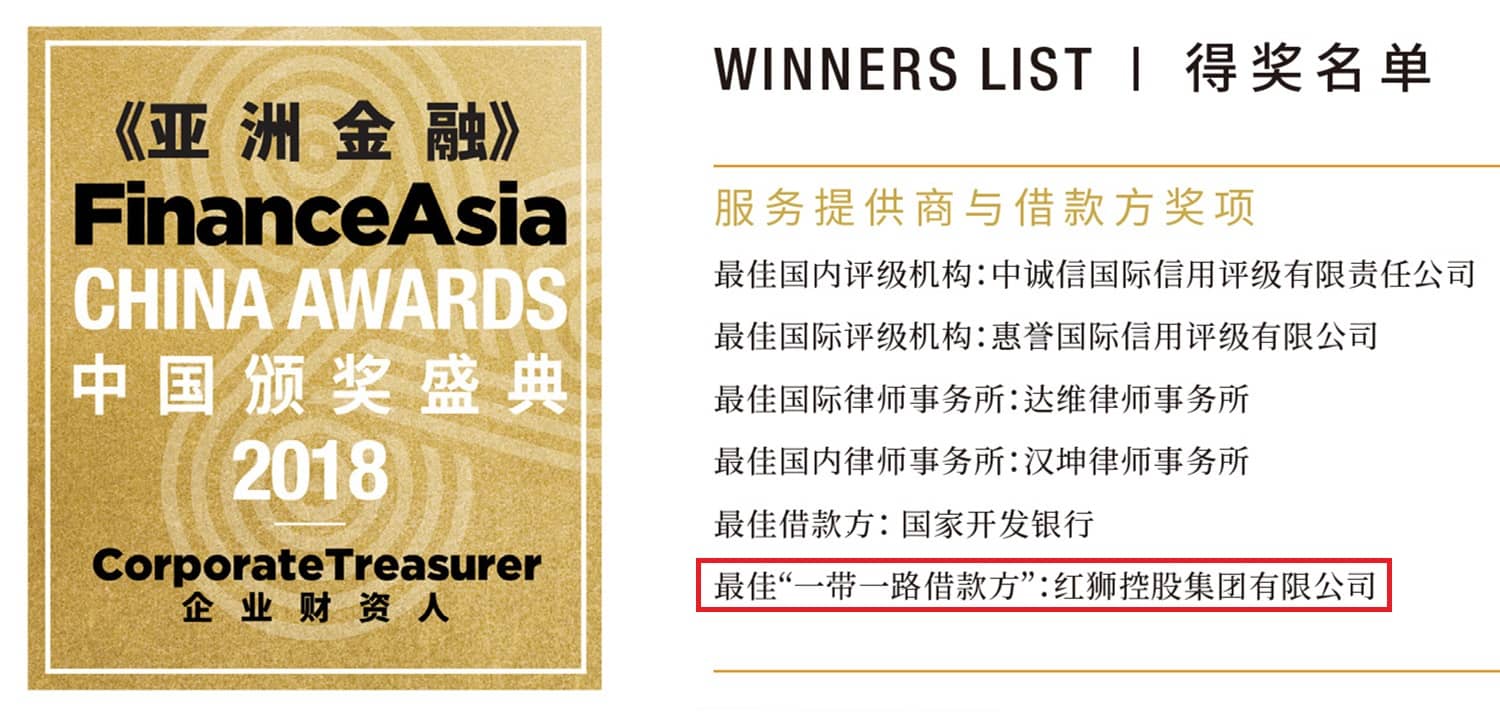 紅獅集團發(fā)行的2018年“一帶一路”公司債券,榮獲“最佳一帶一路借款方”獎(Best Belt & Road Borrower),與中國國際金融股份、國家開發(fā)銀行、中國銀行、高盛集團、匯豐銀行、中誠信評級、國泰君安證券、中信證券等金融機構、銀行、投資銀行及中介機構等一起分享了各項大獎。