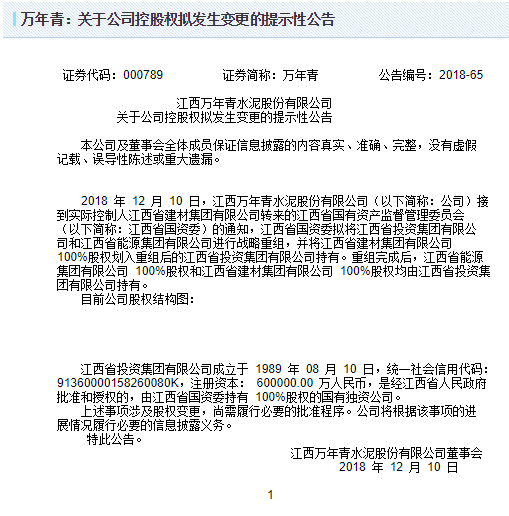 根據(jù)安源煤業(yè)集團股份有限公司關(guān)于控股股東實施戰(zhàn)略重組的提示性公告顯示,接到控股股東江西省能源集團有限公司(以下簡稱“江能集團”)通知,江能集團于2018年12月10日收到江西省國有資產(chǎn)監(jiān)督管理委員會(以下簡稱“江西省國資委”)通知,擬將江西省投資集團有限公司(以下簡稱“江西省投資集團”)和江能集團進行戰(zhàn)略重組,重組完成后,江能集團100%股權(quán)由江西省投資集團持有。目前,相關(guān)程序正報江西省政府批準。與此同時,萬年青也發(fā)布公告,江西省國資委擬將江西省投資集團和江西省能源集團進行戰(zhàn)略重組,并將江西省建材集團100%股權(quán)劃入重組后的江西省投資集團持有。重組完成后,江西省能源集團100%股權(quán)和江西省建材集團100%股權(quán)均由江西省投資集團持有。