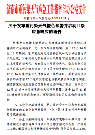 近日,濟南市發(fā)布重污染天氣應(yīng)急工作指揮部辦公室文件 濟南重污染天氣應(yīng)急辦{2018}31號,關(guān)于發(fā)布重污染天氣橙色預(yù)警并啟動Ⅱ級應(yīng)急響應(yīng)的通告。根據(jù)中國環(huán)境監(jiān)測總站與京津冀及周邊地區(qū)省級環(huán)境監(jiān)測中心會商結(jié)果,受不利氣象條件影響,預(yù)計12月14日至16日期間,京津冀及周邊地區(qū)將出現(xiàn)一次區(qū)域性重污染天氣過程。其中我省大部分城市空氣質(zhì)量可能出現(xiàn)連續(xù)出現(xiàn)3天以上重度污染天氣。為有效應(yīng)對重污染天氣,山東省重污染天氣應(yīng)急小組辦公室下發(fā)《關(guān)于切實做好12月14日至12月16日重污染天氣過程應(yīng)對工作的函》