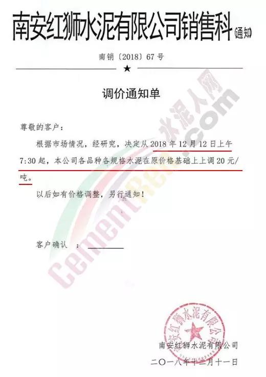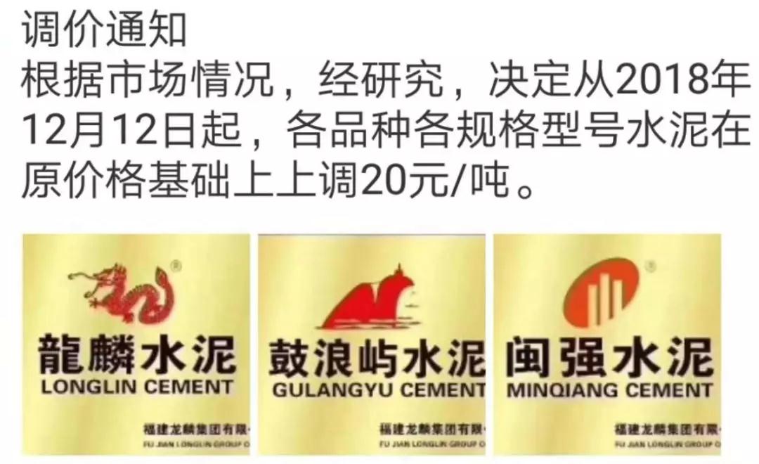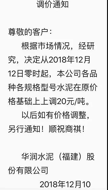 基于目前市場行情,結(jié)合我司實(shí)際情況,經(jīng)我公司研究決定,自2018年12月12日零時(shí)起,我公司發(fā)往福建省全區(qū)域的各品牌、品種袋裝、散裝水泥的出廠價(jià)格在原有基礎(chǔ)上上調(diào): 20元/噸。