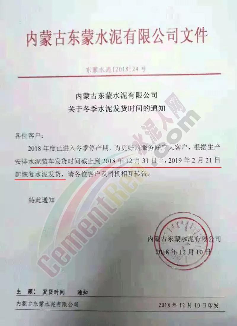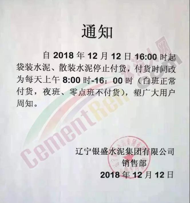 因市場行情變化,經(jīng)研究決定,自2018年12月12日起我公司外售水泥各品牌,各品種,散裝袋裝上調(diào)20元/噸