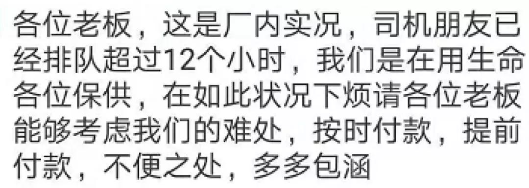 東北市場冰凍了,華南市場卻還是一片火熱。熱銷狀況未有絲毫減弱。經(jīng)銷商發(fā)消息提示下游客戶:司機(jī)排隊(duì)已經(jīng)超過12小時(shí),經(jīng)銷商是用“命”在保供。希望經(jīng)銷商能按時(shí)付款、提前付款。