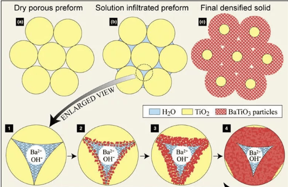 在論文中,Riman教授指出了利用reactive hydrothermal liquid-phase densification (rHLPD)工藝,通過(guò)流體,在傳統(tǒng)的水泥材料微粒上“外包”了一層BaTiO3的原理,見上圖。