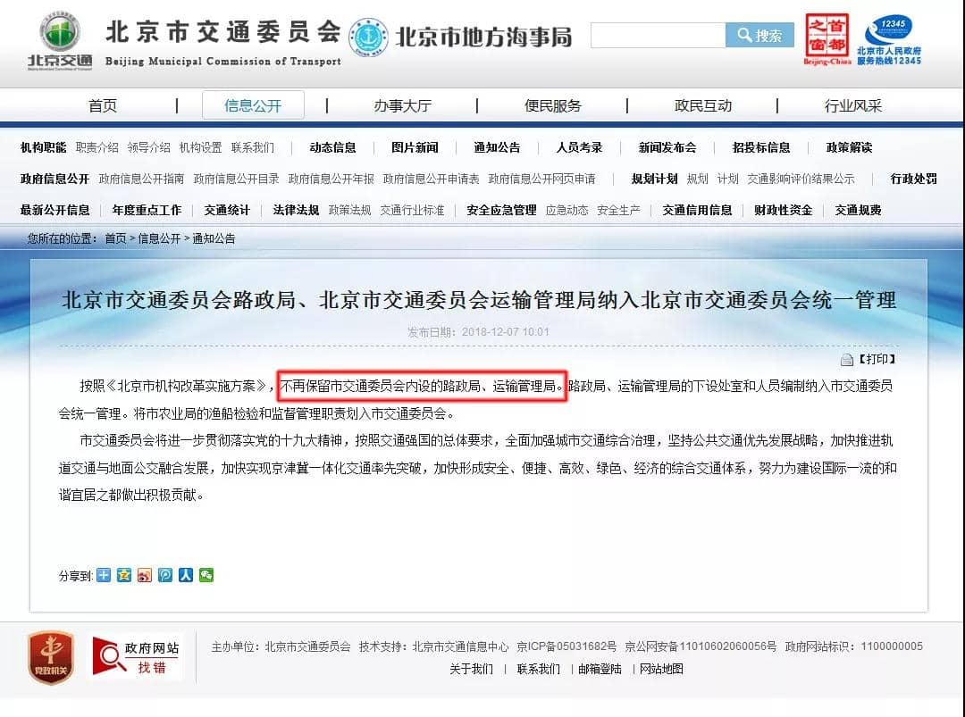 12月7日,據(jù)北京市交通委消息,按照《北京市機構改革實施方案》,不再保留市交通委員會內(nèi)設的路政局、運輸管理局(簡稱路政、運管)。路政局、運輸管理局的下設處室和人員編制納入北京市交通委員會統(tǒng)一管理。