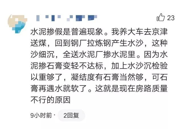 1、有網友說:水泥摻假是普遍現(xiàn)象。我養(yǎng)大車去京津送煤,回到鋼廠拉煉鋼產生水沙,這種沙細沉,全送水泥廠摻水泥里。因為水泥摻石膏變輕不達標,加上水沙沉檢驗以重夠了,凝結度有石膏當然夠,可石膏再遇水就軟了。這就是現(xiàn)在房路質量不行的原因。