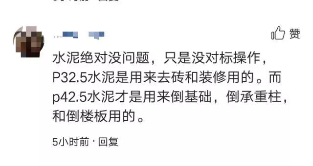 2、還有的網友說:水泥絕對沒問題,只是沒對標操作,P32.5水泥是用來去磚和裝修用的。而P42.5水泥才是用來倒基礎,倒承重柱,和倒樓板用的。