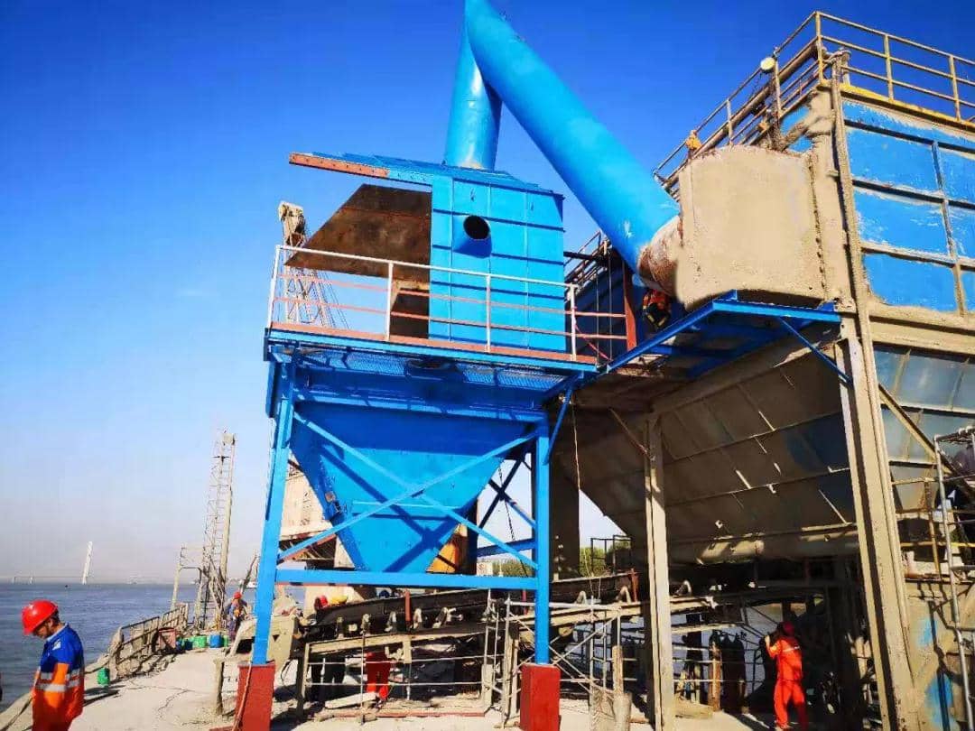 公司水泥原材料熟料、石膏、碎石均從長江船運(yùn)至自有的散貨碼頭進(jìn)廠,利用躉船吊機(jī)用抓斗從運(yùn)輸船里抓起散狀物料,提至約10米高處卸到特定料斗,料斗下面為帶式輸送機(jī)。此作業(yè)方式物料落差大,加上未設(shè)計(jì)安裝收塵設(shè)備,吊料時(shí)造成的揚(yáng)塵很大。