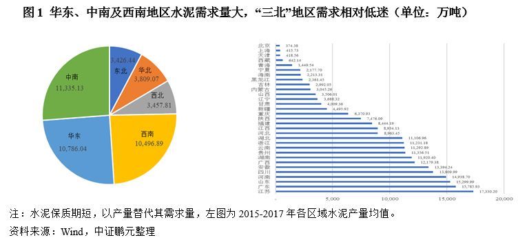 華東、中南及西南地區(qū)水泥需求量大,“三北”地區(qū)需求相對低迷。華東[1]及中南地區(qū)經(jīng)濟發(fā)展水平較高,人口眾多且吸附能力強,逐漸形成了經(jīng)濟發(fā)展促投資、投資拉動經(jīng)濟發(fā)展的良性循環(huán),西南地區(qū)高投資拉動區(qū)域經(jīng)濟高速增長,多省水泥需求超億噸;“三北”地區(qū)地廣人稀,華北經(jīng)濟增速放緩明顯,東北經(jīng)濟相對低迷,西北經(jīng)濟總量落后等難以給水泥需求帶來有效支撐,除河北(供應(yīng)北京及天津)、陜西兩省外,其余省份水泥需求量均較小。整體而言,華東、中南及西南地區(qū)水泥需求量遠遠領(lǐng)先于“三北”地區(qū)。