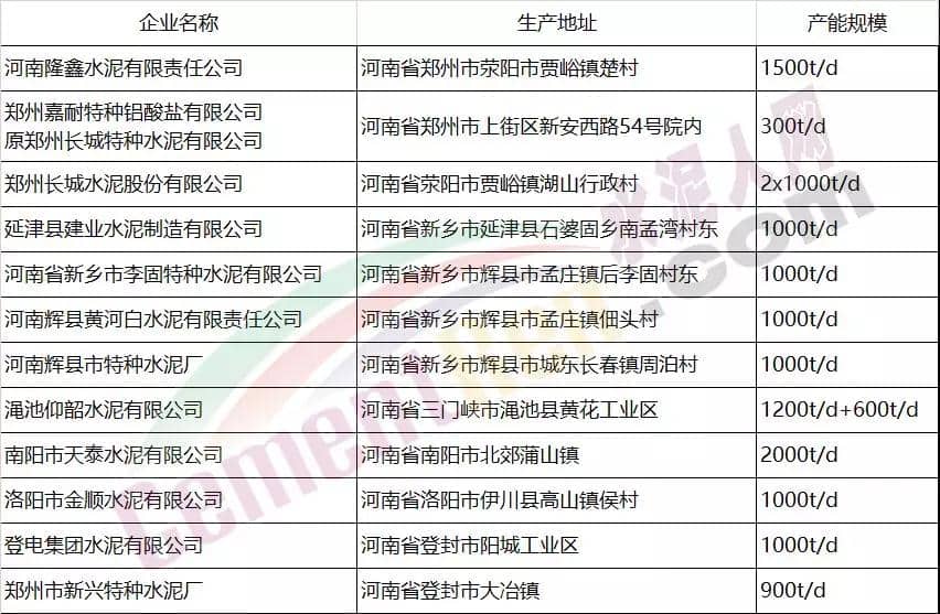 河南省部分熟料生產(chǎn)企業(yè)名單