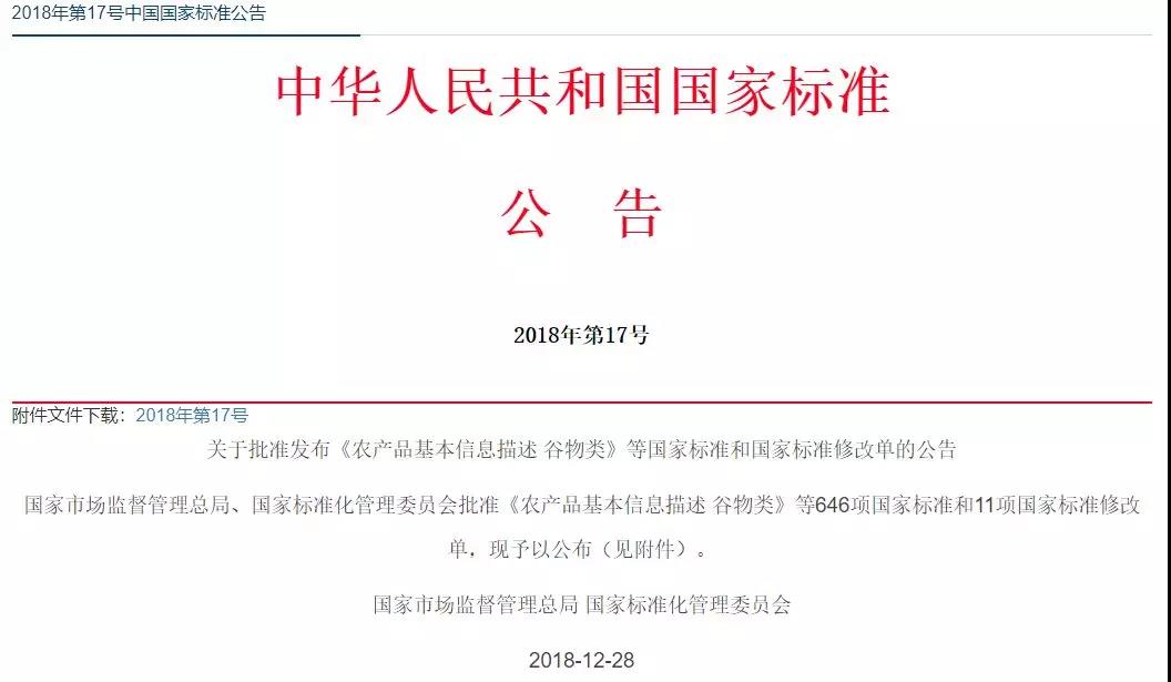 日前,國家標(biāo)準(zhǔn)委發(fā)布關(guān)于批準(zhǔn)發(fā)布《農(nóng)產(chǎn)品基本信息描述 谷物類》等國家標(biāo)準(zhǔn)和國家標(biāo)準(zhǔn)修改單的公告即2018年第17號(hào)中國國家標(biāo)準(zhǔn)公告。公告稱,國家市場監(jiān)督管理總局、國家標(biāo)準(zhǔn)化管理委員會(huì)批準(zhǔn)《農(nóng)產(chǎn)品基本信息描述 谷物類》等646項(xiàng)國家標(biāo)準(zhǔn)和11項(xiàng)國家標(biāo)準(zhǔn)修改單,并予以公布。
