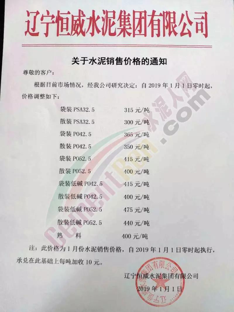 遼寧恒威水泥銷售價格通知