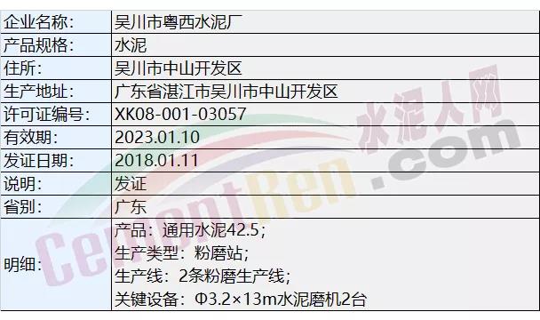 國家質(zhì)檢總局生產(chǎn)許可證辦公室數(shù)據(jù)顯示吳川市粵西水泥廠生產(chǎn)類型為水泥粉磨站,其產(chǎn)品為通用水泥42.5;擁2條粉磨生產(chǎn)線Φ3.2×13m水泥磨機2臺。發(fā)證日期為2018年1月11日。