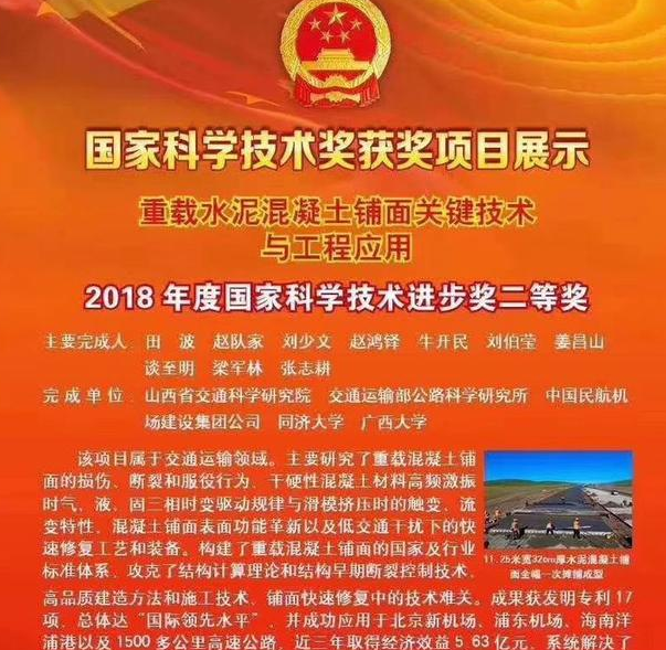 1月8日上午,在北京召開的國家科學(xué)技術(shù)獎勵大會上,宣布了《國務(wù)院關(guān)于2018年度國家科學(xué)技術(shù)獎勵的決定》。山西省共有3項(xiàng)科研成果獲得國家科學(xué)技術(shù)進(jìn)步獎(通用項(xiàng)目)二等獎,其中山西省主持完成的1項(xiàng),參與完成的2項(xiàng)。山西交控集團(tuán)旗下山西省交通科學(xué)研究院主持完成的“重載水泥混凝土鋪面關(guān)鍵技術(shù)與工程應(yīng)用”項(xiàng)目榮獲國家科學(xué)技術(shù)進(jìn)步二等獎,是山西這次唯一主持完成的獲獎項(xiàng)目。