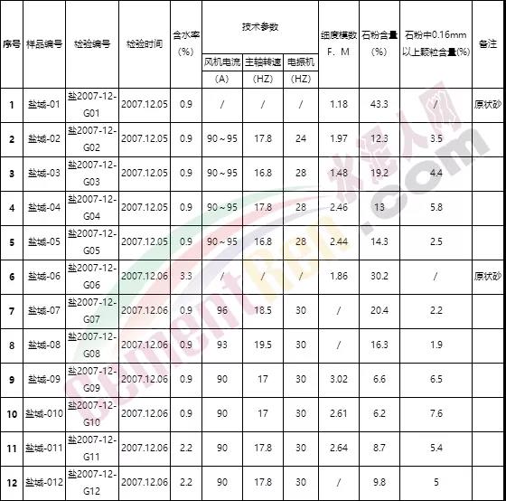 (2)從本次第9~12次試驗(yàn)(試驗(yàn)編號鹽2007—12—G09~G12)可知,在保證供料穩(wěn)定和脫粉機(jī)在同一技術(shù)參數(shù)的情況下,成品砂中石粉含量在一個穩(wěn)定的范圍內(nèi)是有可能的。