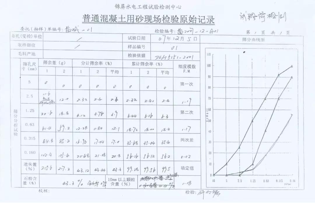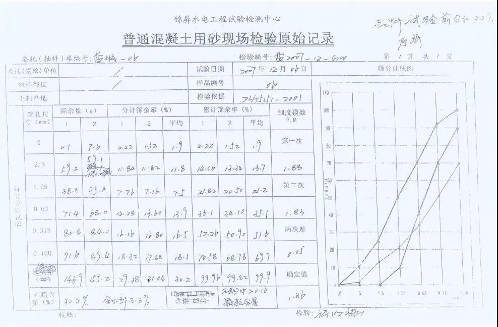 錦屏三灘水電項(xiàng)目所需大量骨料就地取材,采用三灘大理巖,可項(xiàng)目方進(jìn)行了多次全程制砂試驗(yàn),制得的原狀砂石粉含量均在30%以上,最高含量(<0.16mm)達(dá)到43.3%,細(xì)度模數(shù)在1.18~2.13之間波動。原狀砂經(jīng)水洗(或加大沖洗水量)后螺旋洗砂機(jī)回收的成品砂中的石粉含量基本上都大于18%,最高達(dá)到32%。同時,被水洗出去的石粉中仍然含有20~30%大于0.16mm的顆粒,細(xì)砂流失嚴(yán)重,無法滿足工程所規(guī)定的成品砂中石粉含量6~18%的要求。
