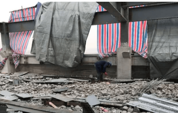 T2樓共18層,18層樓梯間一片雜亂,樓梯臺階的鋼架從水泥里裸露變形,很容易絆腳,樓頂上一片廢墟,有工人正在施工,滿地都是拆掉的水泥塊和鋼材木材,空中還能看到部分房頂?shù)匿摷埽瑯琼斔闹苷趽跤兴芰喜?。問及工期何時結(jié)束,現(xiàn)場工人說“還早著呢”。記者站在T2樓18層樓梯間,噪音巨大,兩人面對面正常音量說話完全聽不見對方,進(jìn)入辦公區(qū)域仍可聽到轟隆隆的噪音。