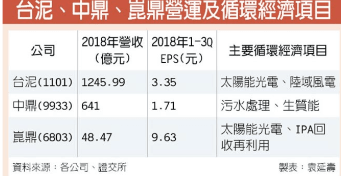 循環(huán)經(jīng)濟正夯,也是市場趨勢,臺泥(1101)、中鼎(9933)、崑鼎(6803)近2年投資的環(huán)保、綠能產業(yè)場域,2019年將可陸續(xù)收成;市場預估,今年這些企業(yè)在循環(huán)經(jīng)濟的產值會比去年翻倍。