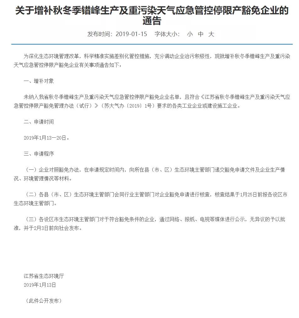 江蘇省生態(tài)環(huán)境廳同期還發(fā)布了《關(guān)于增補(bǔ)秋冬季錯(cuò)峰生產(chǎn)及重污染天氣應(yīng)急管控停限產(chǎn)豁免企業(yè)的通告》。通告稱為深化生態(tài)環(huán)境管理改革,科學(xué)精準(zhǔn)實(shí)施差別化管控措施,充分調(diào)動(dòng)企業(yè)治污積極性,就增補(bǔ)秋冬季錯(cuò)峰生產(chǎn)及重污染天氣應(yīng)急管控停限產(chǎn)豁免企業(yè)有關(guān)事項(xiàng)通告如下:
