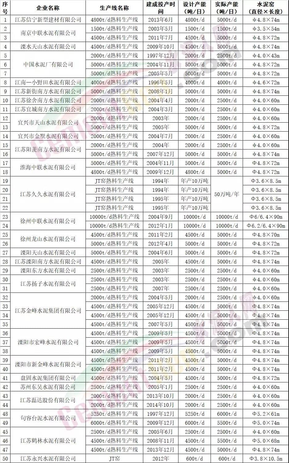 備注:上述數(shù)據(jù)來(lái)源于水泥人網(wǎng)信息中心數(shù)據(jù)庫(kù),截止2017年12月31日位于江蘇省鎮(zhèn)江市潤(rùn)州區(qū)韋崗街道的江蘇聯(lián)合水泥有限公司的6000t/d熟料生產(chǎn)線(Φ5.2×61m水泥窯)已按100萬(wàn)噸/年產(chǎn)能公告,用于產(chǎn)能置換 。