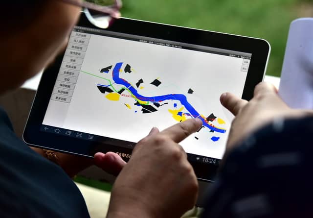 2017年9月7日,原環(huán)境保護(hù)部組織的長江經(jīng)濟(jì)帶飲用水水源地環(huán)境保護(hù)執(zhí)法專項行動第一督查組在湖北武漢督查。圖為督查人員通過飲用水水源保護(hù)區(qū)現(xiàn)場巡查衛(wèi)星遙感支持系統(tǒng)在現(xiàn)場檢查。攝影/章軻