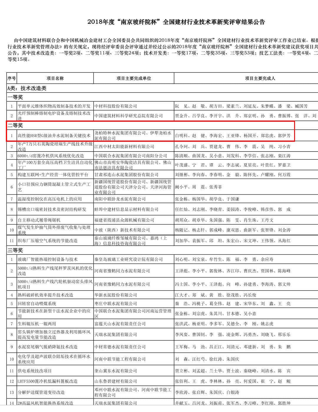 由中國建筑材料聯(lián)合會和中國機械冶金建材工會全國委員會共同組織的2018年度“南京玻纖院杯”全國建材行業(yè)技術革新獎評審工作業(yè)已結(jié)束, 堯柏集團《高性能HSR型G級油井水泥制備關鍵技術》項目榮獲2018年度全國建材行業(yè)技術革新獎技術改造類二等獎。