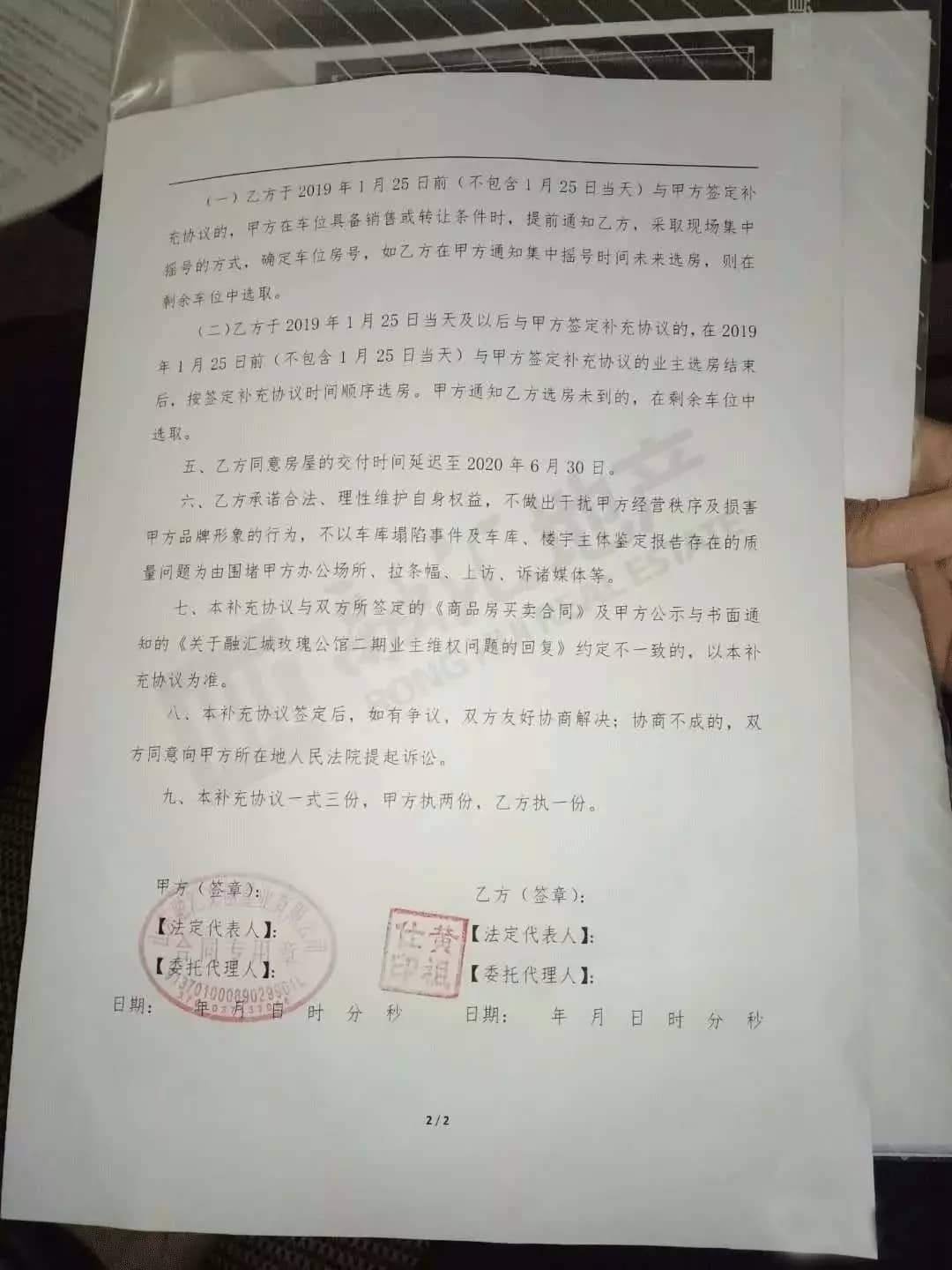 以上實(shí)證,暴露了該項(xiàng)目存在建筑質(zhì)量不合格,監(jiān)督不到位,整體質(zhì)量無(wú)保障等問(wèn)題。面對(duì)檢測(cè)結(jié)果和樓盤(pán)質(zhì)量,開(kāi)發(fā)商與2019年1月6日發(fā)表公告:向業(yè)主免費(fèi)贈(zèng)送車(chē)位,誘導(dǎo)購(gòu)房者在加固方案送審之前簽訂補(bǔ)充協(xié)議,但在隨后的補(bǔ)充協(xié)議附加多條霸王條款和不明確規(guī)定,嚴(yán)重侵害購(gòu)房者權(quán)益。另外,開(kāi)發(fā)商在購(gòu)房合同后隱藏附加協(xié)議,如將交房條件之一的《分期綜合驗(yàn)收備案證明》改為《建設(shè)工程竣工備案表》,以格式條款為由,誤導(dǎo)購(gòu)房者簽字。