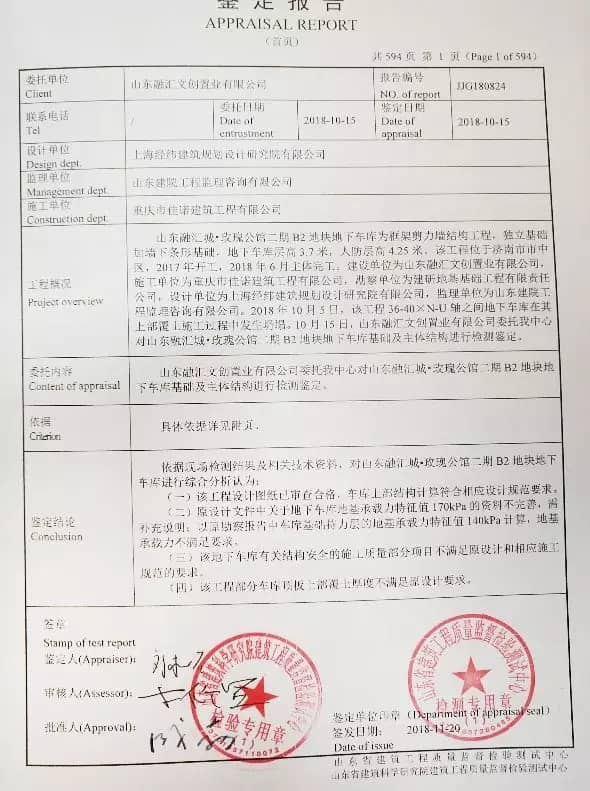 春節(jié)期間,水泥人網(wǎng)收到上千業(yè)主聯(lián)名舉報(bào)因山東濟(jì)南市融匯城玫瑰公館2期1-4號(hào)樓之間車(chē)庫(kù)坍塌,經(jīng)委托第三方機(jī)構(gòu)檢測(cè)發(fā)現(xiàn)1-6號(hào)樓主體也存在相關(guān)質(zhì)量問(wèn)題。業(yè)主幾番維權(quán)無(wú)果,遂求助水泥人網(wǎng),并提供了6棟樓主體和地下車(chē)庫(kù)的第三方檢測(cè)報(bào)告和一份公開(kāi)上訪信。