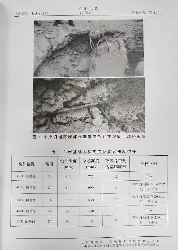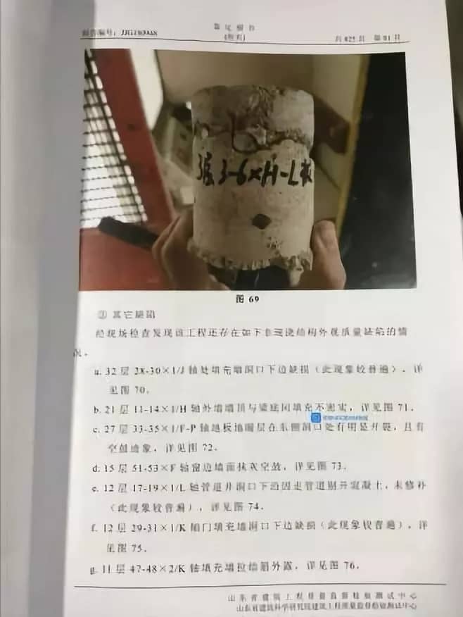以#3樓為例,基礎(chǔ)承臺(tái)及上部防水混凝土質(zhì)量抽檢8項(xiàng)中4項(xiàng)不合格(含摔斷);–2至32層混凝土強(qiáng)度:剪力墻,梁、板無(wú)一層全都合格;截面尺寸及鋼筋配置:負(fù)二層至32層,約一半不合格;層高、軸線位置樓房主體結(jié)構(gòu)都存在嚴(yán)重不合格情況。此外,在車(chē)庫(kù)塌方事故現(xiàn)場(chǎng)以及樓房主體檢測(cè)時(shí)發(fā)現(xiàn)斷裂的混凝土內(nèi)摻雜飲料瓶,鋼筋稀疏、混凝土松散等嚴(yán)重問(wèn)題。#3樓報(bào)告中69處外部可見(jiàn)缺陷中52處屬于嚴(yán)重缺陷!