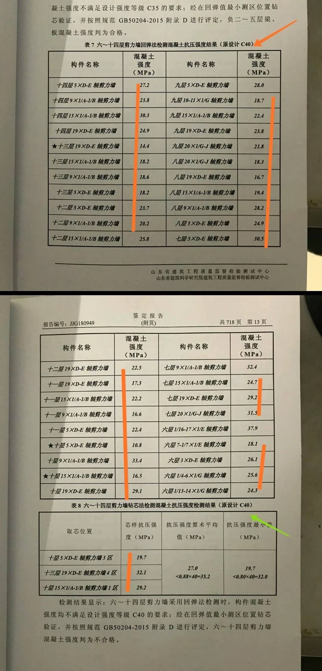 從業(yè)主提供的山東省建筑工程質(zhì)量監(jiān)督檢驗(yàn)測(cè)試中心山東省建筑科學(xué)研究院建筑工程質(zhì)量監(jiān)督檢驗(yàn)測(cè)試中心對(duì)濟(jì)南市融匯城玫瑰公館2期6棟封頂后進(jìn)行裝飾施工的33層樓的檢測(cè)報(bào)告中可以看到,1-6號(hào)樓均存在混凝土強(qiáng)度不達(dá)標(biāo)等質(zhì)量問(wèn)題。