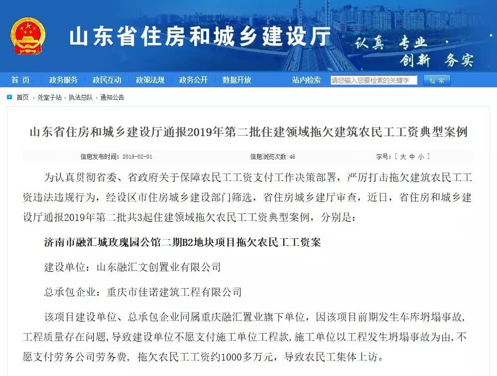 據(jù)水泥人網(wǎng)了解,濟(jì)南市融匯城玫瑰園公館二期B2地塊項(xiàng)目背后的“故事”不僅僅是這幾幢樓。本月初,山東省住建廳通報(bào)的2019年第二批住建領(lǐng)域拖欠建筑農(nóng)民工資的三起典型案例中,濟(jì)南市融匯城玫瑰園公館二期B2地塊項(xiàng)目赫然在列。其描述為該項(xiàng)目建設(shè)單位、總承包企業(yè)同屬重慶融匯置業(yè)旗下單位,因該項(xiàng)目前期發(fā)生車(chē)庫(kù)坍塌事故,工程質(zhì)量存在問(wèn)題,導(dǎo)致建設(shè)單位不愿支付施工單位工程款,施工單位以工程發(fā)生坍塌事故為由,不愿支付勞務(wù)公司勞務(wù)費(fèi), 拖欠農(nóng)民工工資約1000多萬(wàn)元,導(dǎo)致農(nóng)民工集體上訪。