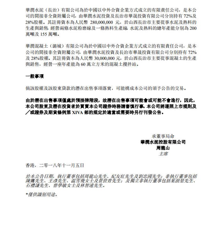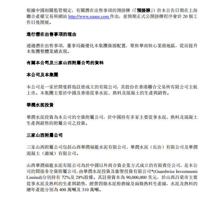 華潤(rùn)水泥控股(01313)公布,就潛在出售3家山西附屬公司,2019年1月25日已完成征集意向受讓方的階段,根據(jù)上海聯(lián)合產(chǎn)權(quán)交易所出具的受讓資格反饋函,經(jīng)審慎考慮意向受讓方基本情況后,該公司認(rèn)為繼續(xù)公開掛牌將無法實(shí)現(xiàn)聯(lián)合出售3家山西附屬公司的商業(yè)目標(biāo),因此,華潤(rùn)水泥投資已于公告日期正式通知上海聯(lián)合產(chǎn)權(quán)交易所撤銷本次公開掛牌。
