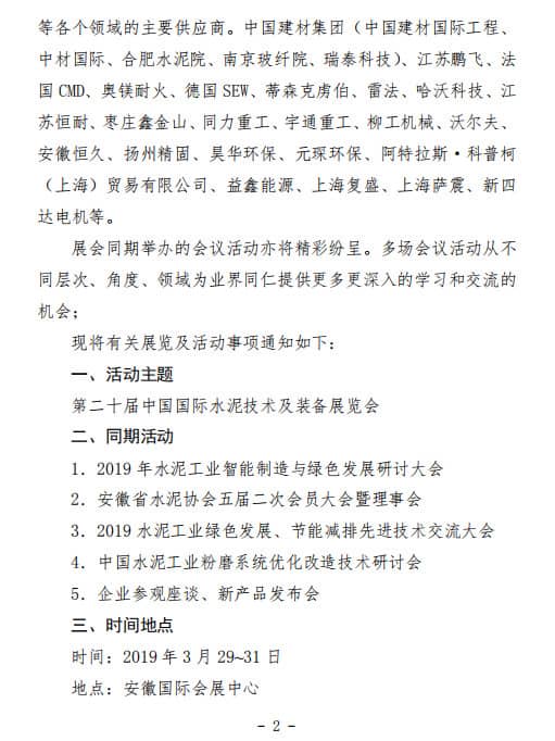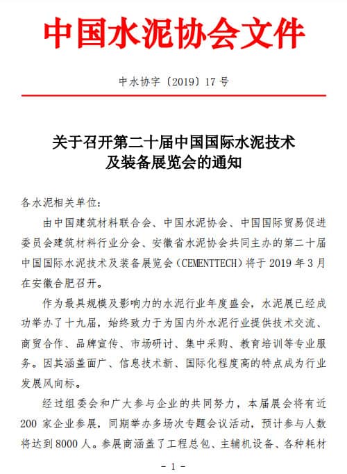中國水泥協(xié)會、中國國際貿(mào)易促進委員會建筑材料行業(yè)分會、安徽省水泥協(xié)會共同主辦的第二十屆中國國際水泥技術(shù)及裝備展覽會(CEMENTTECH)將于 2019 年 3 月在安徽合肥召開。通知全文如下: