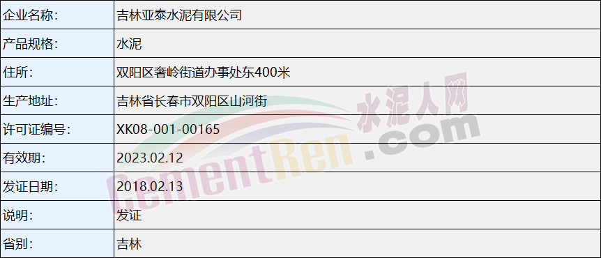 吉林亞泰水泥有限公司生產(chǎn)許可證信息